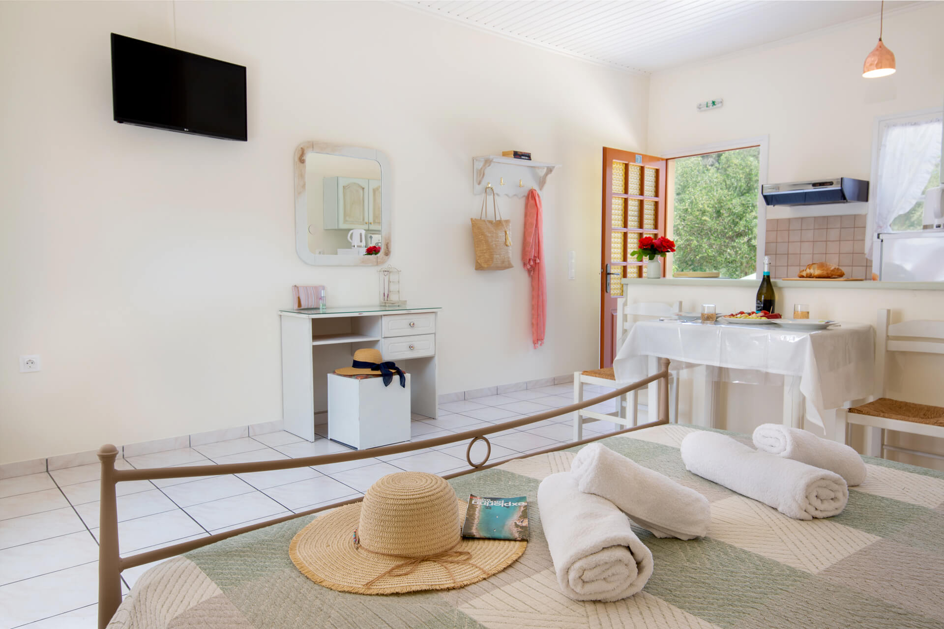 If you want to combine the peace of your accommodation with the cosmopolitan noise of Lakka, Livadi Studios are waiting for you. It is a peaceful place to read your book by the pool, accompanied by the chirping of birds, as it is located in an ancient olive grove, a secluded location of the village. Just a 2 minute walk to Lakka and about a 10 minute walk to the nearest beaches. So, you can choose to wander the straits and port of Lakka or simply relax around the pool or in the specially designed areas of the large and colorful garden.  For those who love the outdoors, you can't miss the relaxation offered by your private balcony - furnished with table and chairs - overlooking the garden or the pool. The road from the village to the studios is flat with no hilly section. During the night there are street lights. You can park your car in our private lot.